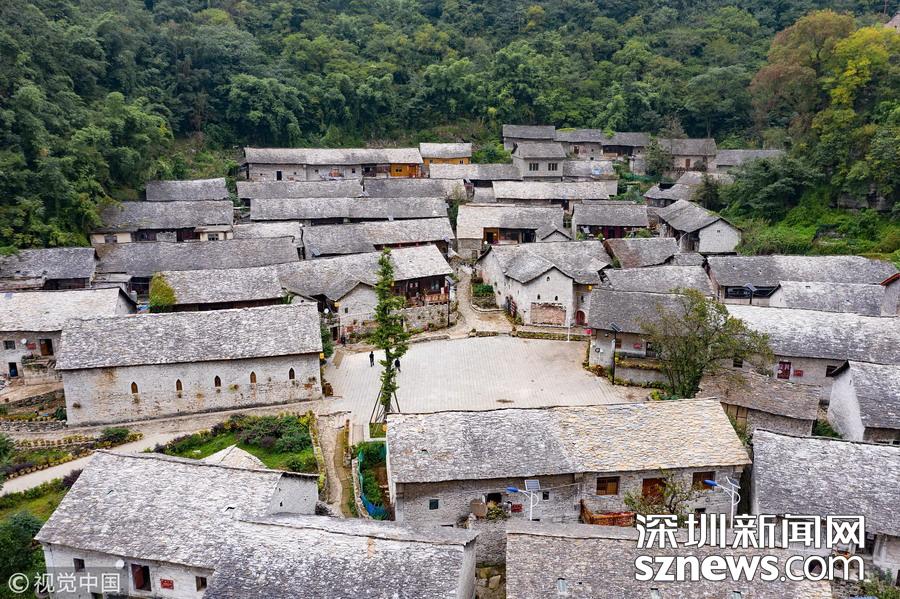 深圳新聞網訊  2018年9月27日,貴州安順,航拍坐落在群山中的鎮寧布依族苗族自治縣高蕩村。鎮寧高蕩村民居為石木結構干欄式石板房,建造時間五、六十年至數百年不等,建筑保存基本完好。