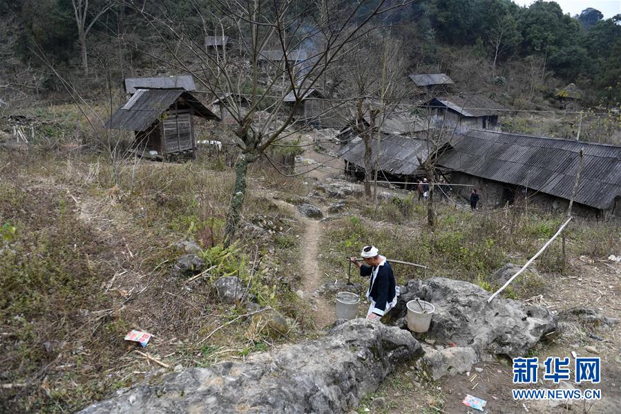 在廣西南丹縣里湖瑤族鄉仁廣村,一名白褲瑤族同胞在挑水(1月12日攝)。如今,搬遷后的白褲瑤族同胞都用上了自來水。新華社記者 周華 攝