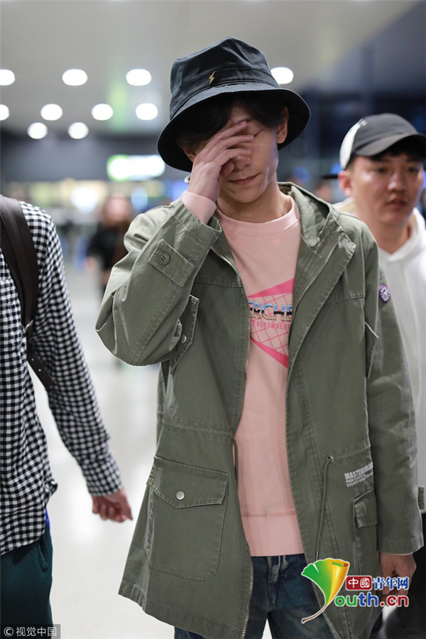 2018年10月14日,上海,張一山抵達(dá)上海機(jī)場。張一山戴漁夫帽眼袋嚴(yán)重瞬間老十歲, 用手擋臉?biāo)撇辉干乡R。