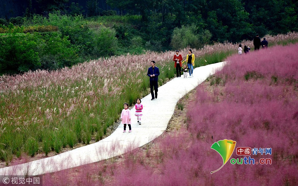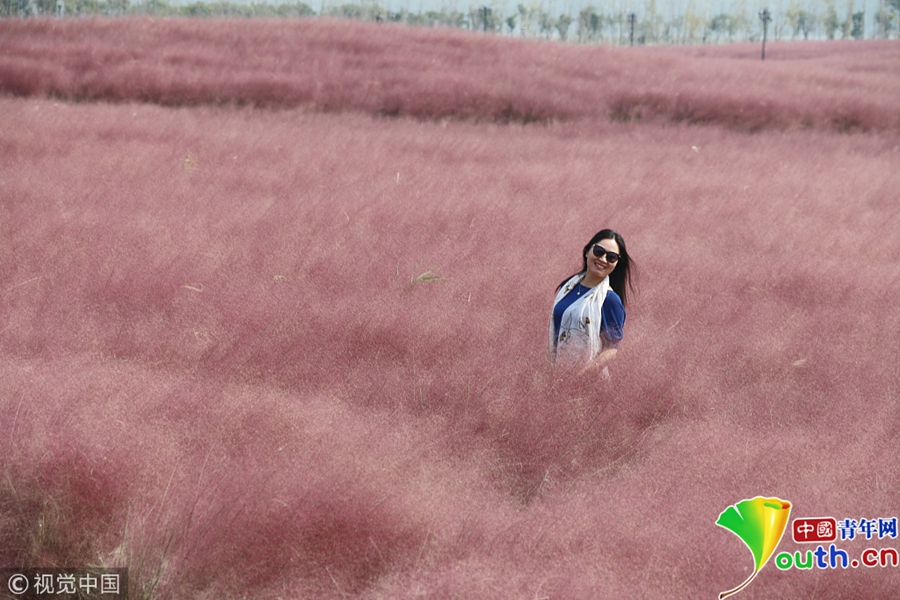 中國青年網北京10月7日電 2018年10月6日,游客在“粉色田野”里游玩、留影。粉黛亂子草是一種觀賞草種,該植物夏季為主要生長季,全株綠色,花期為9月中旬至11月中旬,開花時,綠葉為底,粉紫色花穗如發絲從基部長出,遠看如紅色云霧。