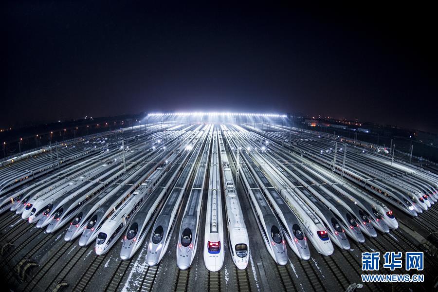 2018年2月1日凌晨,動車組停靠在武漢動車段的存車線上,準備進行檢修和保溫作業。近百組在武漢動車段經過檢修、保溫作業的動車組蓄勢待發,迎接春運。新華社記者 肖藝九 攝