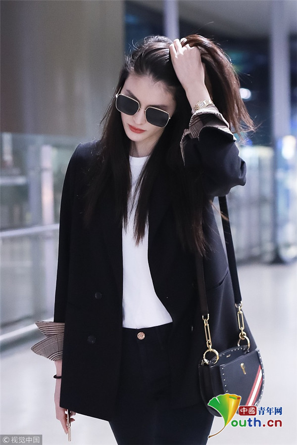 2018年10月15日,上海,何穗亮相機場。她身穿深色西裝搭配黑色緊身褲大秀超模身材,簡約造型依舊高級感十足,輕撩秀發(fā)散發(fā)女人味。