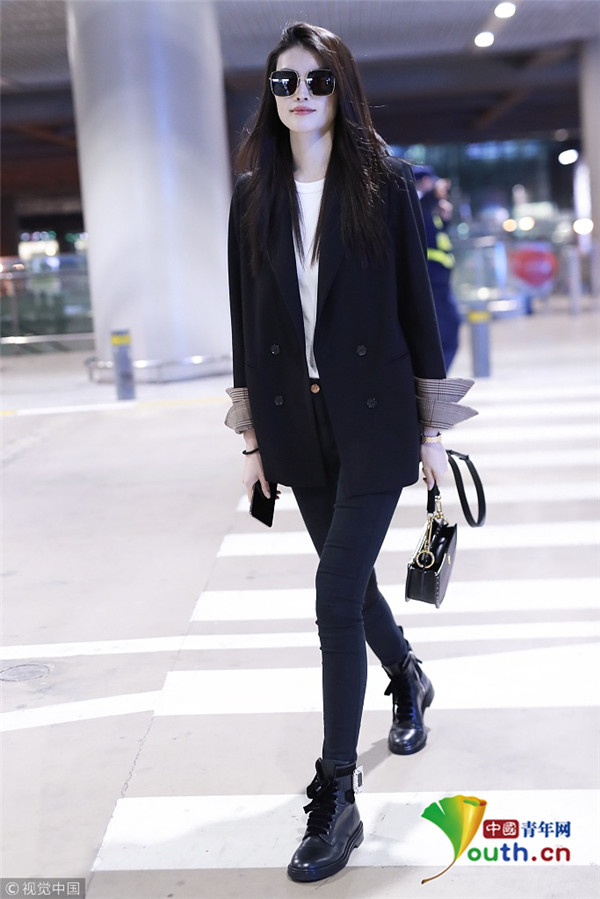 2018年10月15日,上海,何穗亮相機場。她身穿深色西裝搭配黑色緊身褲大秀超模身材,簡約造型依舊高級感十足,輕撩秀發散發女人味。