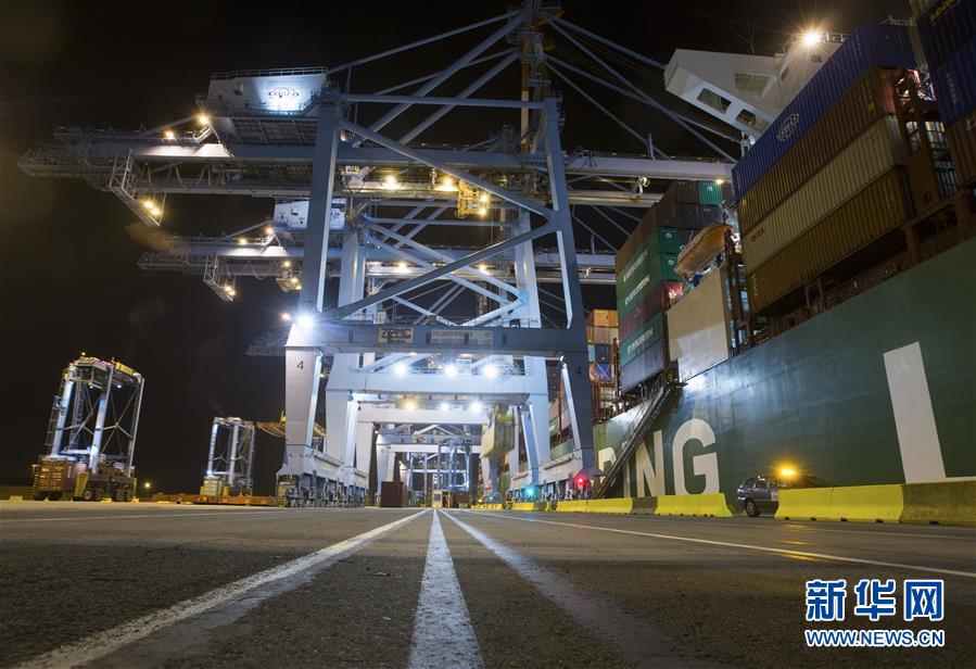 這是10月15日晚在比利時澤布呂赫港拍攝的正在進行裝卸作業的集裝箱碼頭。新華社記者 葉平凡 攝