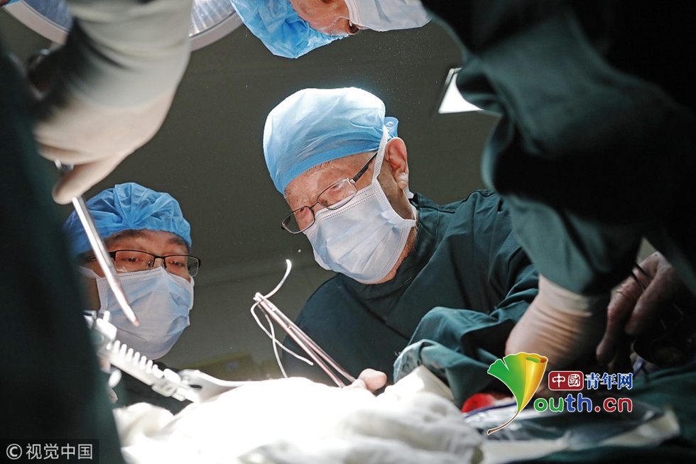 2018年4月13日,在江蘇省徐州市第一人民醫(yī)院手術(shù)室,96歲高齡的“中國(guó)肝膽外科之父”、中國(guó)科學(xué)院院士吳孟超親自為患者進(jìn)行手術(shù)。當(dāng)日,吳孟超院士和中國(guó)人民解放軍海軍軍醫(yī)大學(xué)附屬東方肝膽外科醫(yī)院的醫(yī)療團(tuán)隊(duì)來(lái)到江蘇徐州為患者進(jìn)行手術(shù)。 殷立勤/視覺中國(guó)