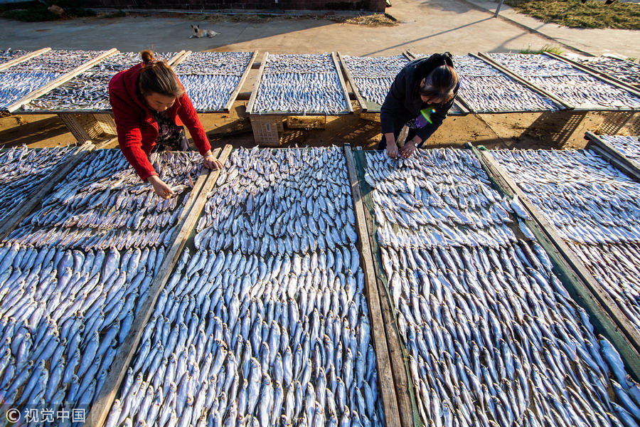江西都昌縣薌溪鄉的漁民趁著晴好天氣翻曬捕撈上岸的魚蝦。