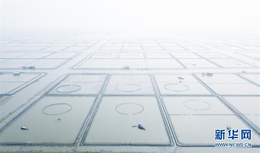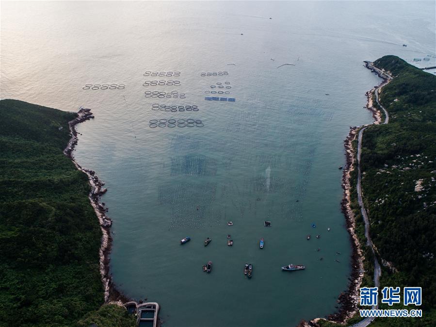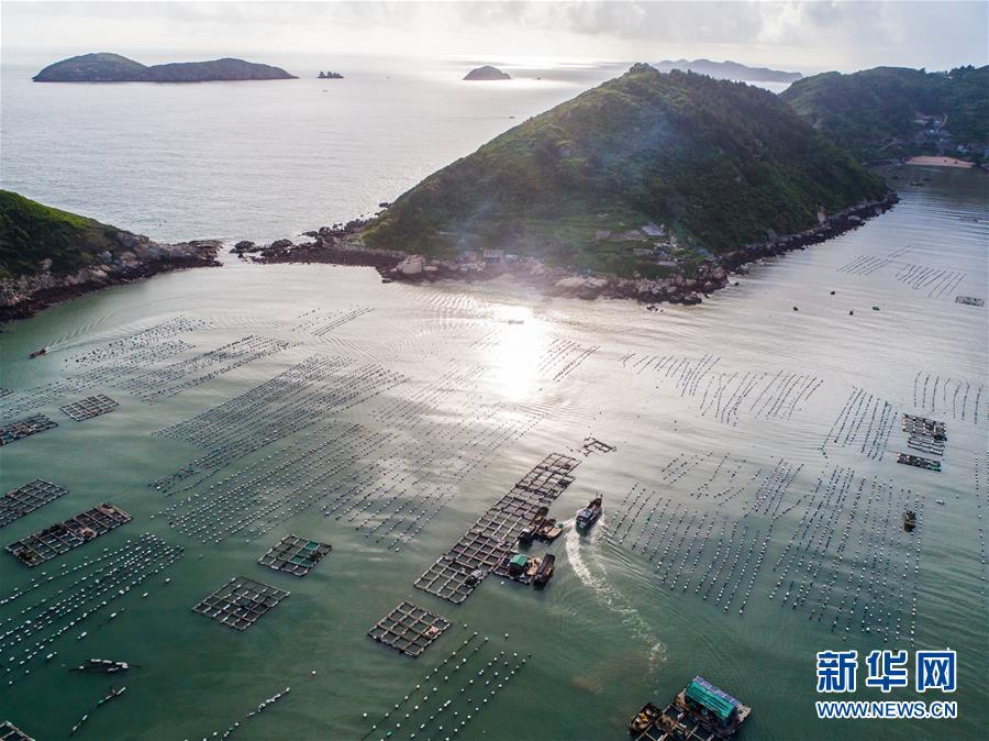 8月19日,空中俯瞰南麂島海域內的“海上牧場”養殖區(無人機拍攝)。南麂島位于浙江東南海域,水質好,水溫、鹽度都適合大黃魚等養殖魚類的生長繁殖,因此當地的水產品也一直保持了較高的品質和口碑。進入8月,浙江省溫州市平陽縣南麂鎮海域上大片的大黃魚、貽貝等特色海產品養殖區域迎來豐收季節,養殖戶們駕駛漁船在養殖區海域進行打撈收獲,在碧海藍天下構成了一幅“海上牧場”的美麗豐收景象。近年來,南麂鎮政府引導漁民養殖戶充分發揮“靠海吃海”的資源優勢,大力發展海洋養殖經濟和海島旅游經濟,實現了南麂由“生態美”向“產業美”,“產業美”向“經濟美”的轉變。同時該鎮堅持以大黃魚、貽貝等為特色產業支撐,精準發展高效海洋養殖業,重點培養一批新型職業漁民,依靠專業技術支持,實現深海仿生養殖,讓好生態造就好品質,重點打造南麂養殖品牌,組建營銷網絡,拓展特色海產品市場。新華社記者 徐昱攝
