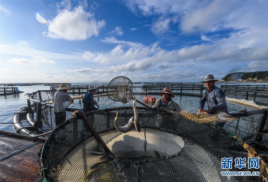 8月18日,南麂島海域內的“海上牧場”養殖區內,漁民正捕撈大黃魚,處于仿生養殖環境的大黃魚需要生長2至3年。進入8月,浙江省溫州市平陽縣南麂鎮海域上大片的大黃魚、貽貝等特色海產品養殖區域迎來豐收季節,養殖戶們駕駛漁船在養殖區海域進行打撈收獲,在碧海藍天下構成了一幅“海上牧場”的美麗豐收景象。近年來,南麂鎮政府引導漁民養殖戶充分發揮“靠海吃海”的資源優勢,大力發展海洋養殖經濟和海島旅游經濟,實現了南麂由“生態美”向“產業美”,“產業美”向“經濟美”的轉變。同時該鎮堅持以大黃魚、貽貝等為特色產業支撐,精準發展高效海洋養殖業,重點培養一批新型職業漁民,依靠專業技術支持,實現深海仿生養殖,讓好生態造就好品質,重點打造南麂養殖品牌,組建營銷網絡,拓展特色海產品市場。新華社記者 徐昱攝