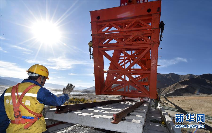 中鐵十一局的工人在川藏鐵路拉林段昌果特大橋進行鋪軌作業(10月16日攝)。 近日,川藏鐵路拉薩至林芝段昌果特大橋開始鋪設行軌排、架設梁片,標志著川藏鐵路拉林段正式進入鋪軌階段。 新華社記者 覺果 攝