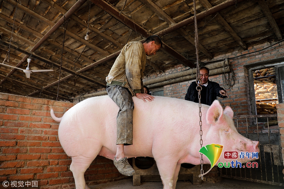 2018年10月16日,遼寧丹東,900斤重的大豬,堪稱豬中巨無霸,豈不是炙手可熱的網紅一枚?大小老板還不得帶上銀子蜂擁而至?然而,今年不行了,受遼寧多地豬瘟疫情影響,900斤大豬無人問津。本想靠著這頭巨無霸大豬刷爆朋友圈甚至賣個大價錢的養豬人張先生,現在非常擔心一頭好豬爛在手上。10月16日,遼寧丹東。當著來圍觀的鄉親的面,養豬人張先生小心翼翼地騎上了豬背,希望用這樣的造型求關注。