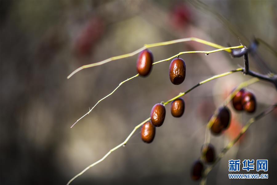 10月20日,在且末縣阿熱勒鎮有機紅棗園里,成熟的紅棗掛在枝頭。 新華社記者 趙戈 攝