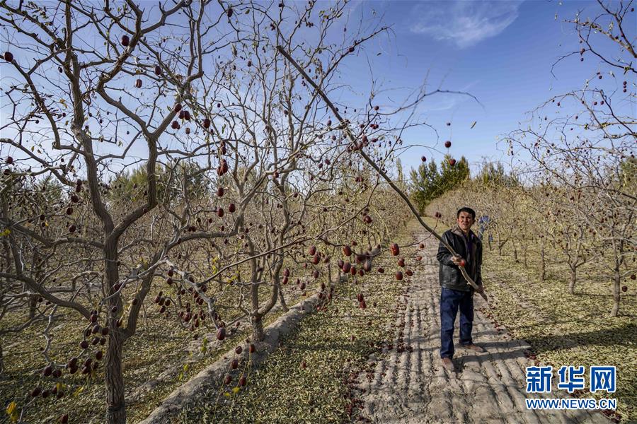 10月20日,在且末縣阿熱勒鎮有機紅棗園里,棗農在打棗。 新華社記者 趙戈 攝