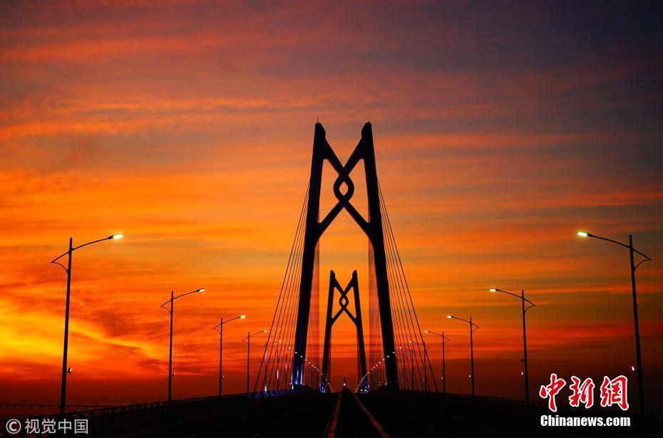 2018年7月18日,珠海,滿天紅霞,亮燈后的港珠澳大橋跨立在伶仃洋上,進入通車前的最后準備。張由瓊 攝 圖片來源:視覺中國