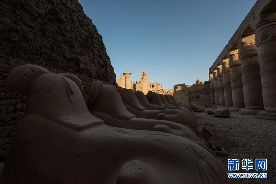 這是10月23日在埃及盧克索拍攝的卡納克神廟內的石柱與雕像。新華社記者 孟濤 攝