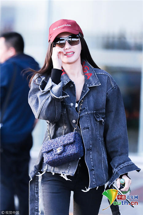 2018年10月24日,北京,“富察皇后”秦嵐現身機場。她頭戴小紅帽,身穿黑色緊身褲顯美腿筆直修長,上身穿著牛仔外套青春逼人,邊走邊甜笑玩“撩發殺”,靚麗吸睛。
