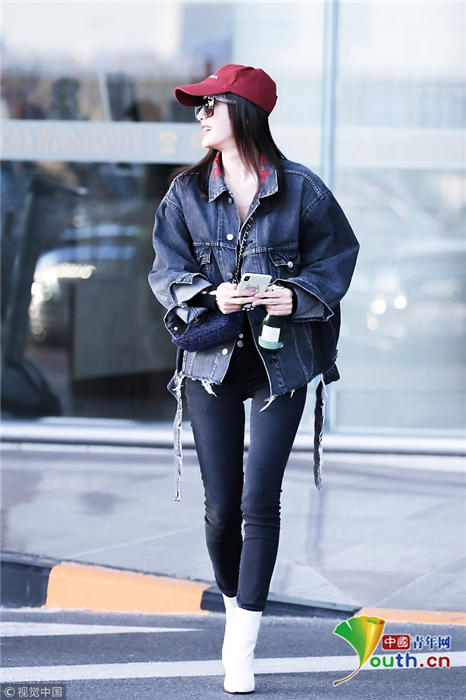 2018年10月24日,北京,“富察皇后”秦嵐現身機場。她頭戴小紅帽,身穿黑色緊身褲顯美腿筆直修長,上身穿著牛仔外套青春逼人,邊走邊甜笑玩“撩發殺”,靚麗吸睛。