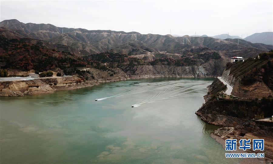 10月24日,兩艘快艇從劉家峽水庫庫區駛過(無人機拍攝)。  新華社記者 陳斌 攝
