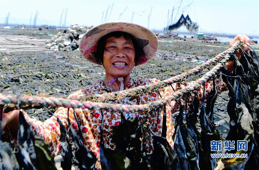 5月17日,在霞浦縣沙江鎮沙江村碼頭,養殖戶在晾曬海帶。