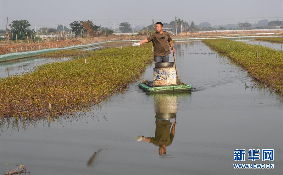 “70后”村民李錦和在自家蟹塘里給螃蟹苗喂食(10月24日攝)。李錦和在開弦弓村經營著近50畝蟹塘,專養螃蟹苗,每天從早上5點就開始忙碌,到了10月份蟹苗上市的季節就更加忙碌了,幾乎日夜守護在蟹塘邊。開弦弓村90%的水域用于水產養殖,以蝦蟹為主。 新華社記者 季春鵬攝