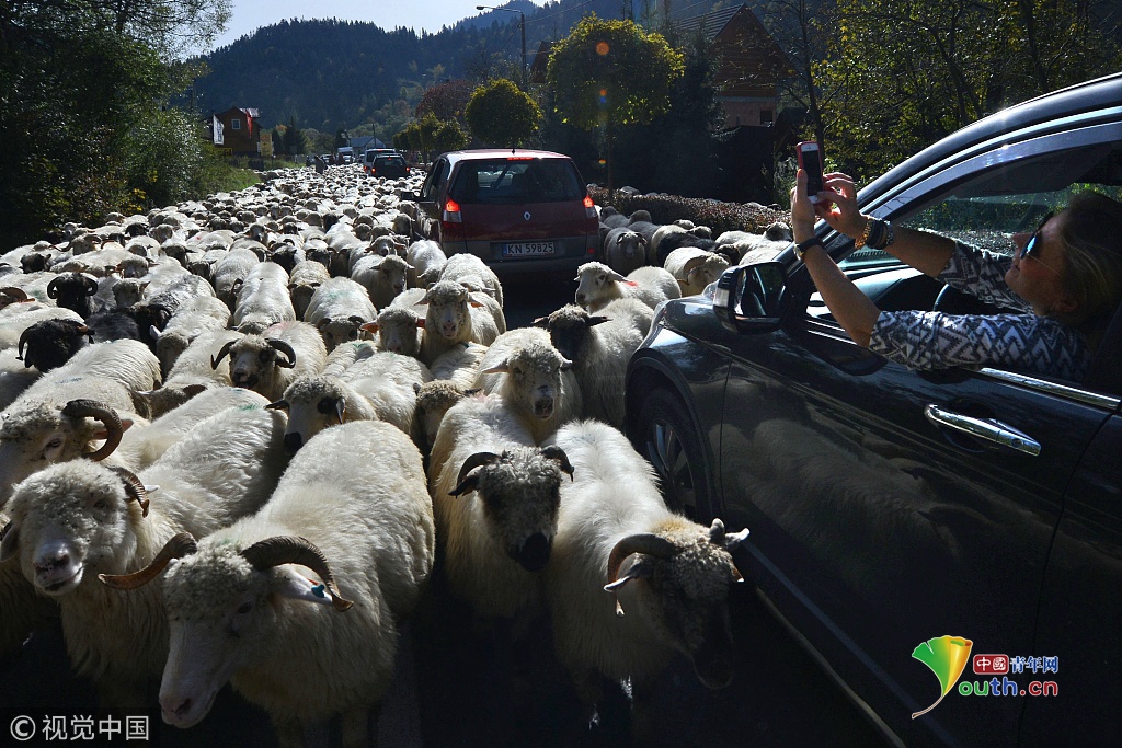 2018年9月27日訊(具體拍攝時(shí)間不詳),波蘭,浩浩蕩蕩的綿羊大軍為了趕在冬天之前回到農(nóng)場過冬,阻斷了鄉(xiāng)村的主車道。