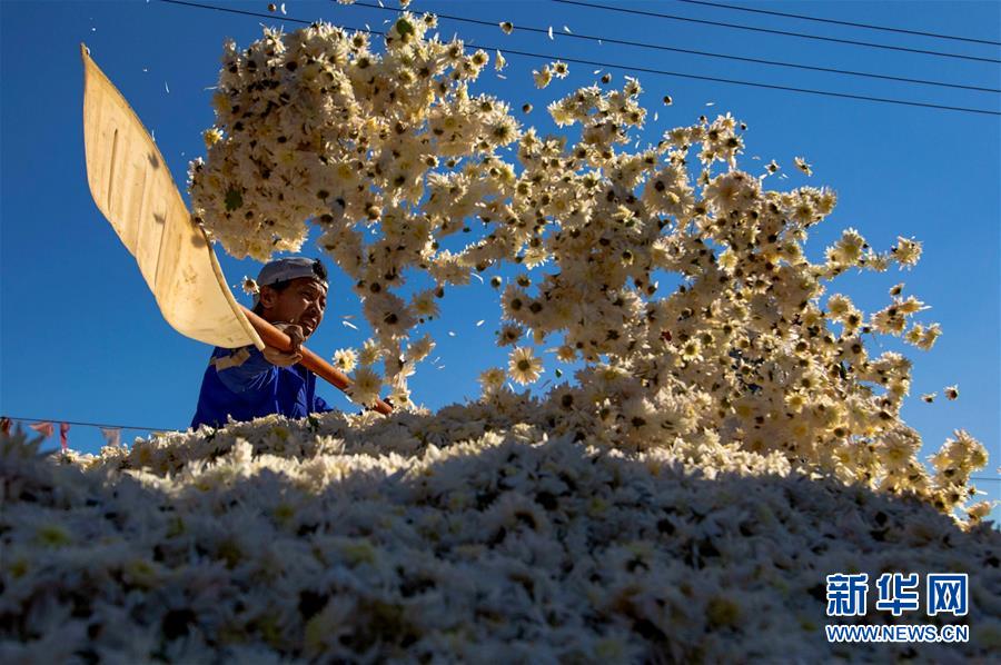 10月30日,武安市午汲鎮東河下村村民在晾曬菊花。 新華社記者 王曉 攝
