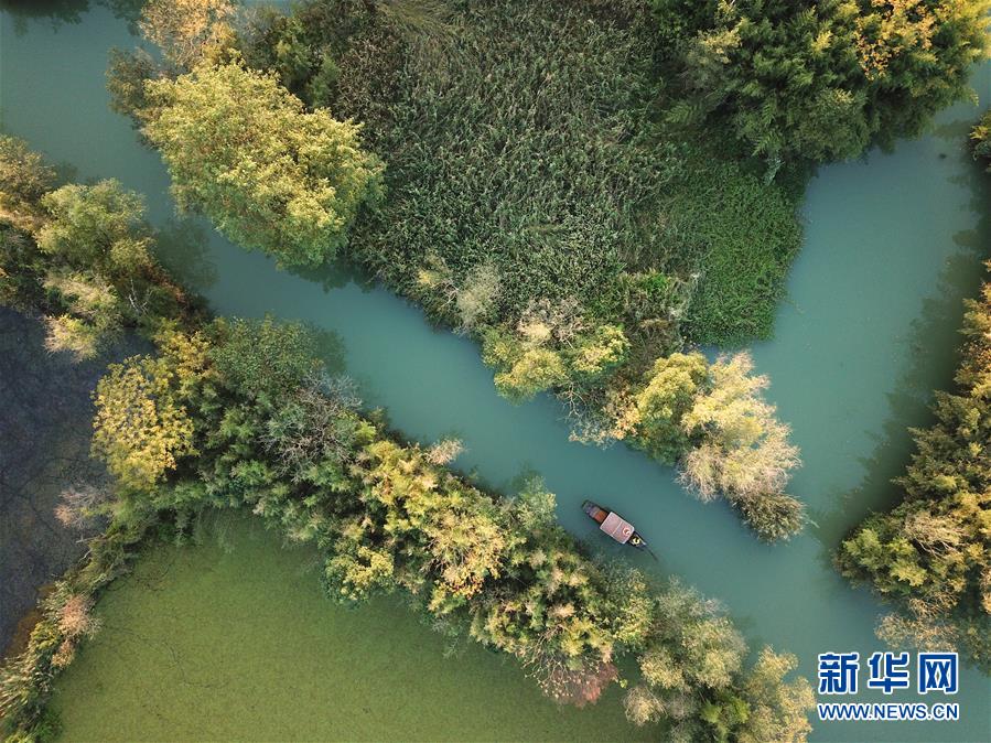 10月29日,游船行駛在西溪濕地河道上(無人機(jī)拍攝)。 新華社記者翁忻旸攝