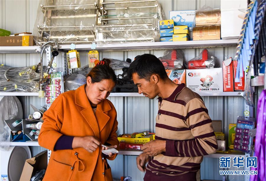 在位于澤普縣桐安鄉的建材鋪里,熱娜古麗·喀爾曼(左)跟前來購買建材的顧客交談(10月28日攝)。  新華社記者 關俏俏 攝