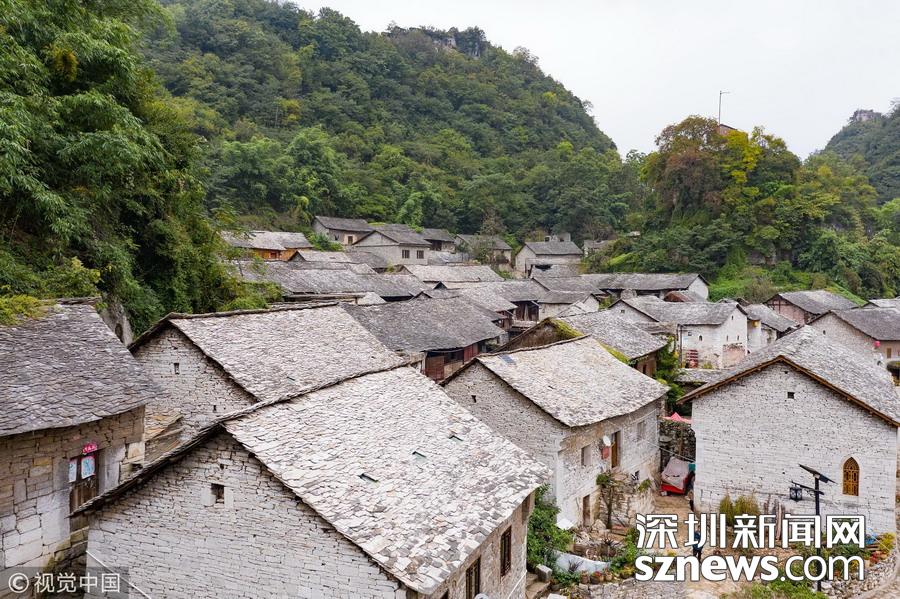 深圳新聞網訊 2018年9月27日,貴州安順,航拍坐落在群山中的鎮寧布依族苗族自治縣高蕩村。鎮寧高蕩村民居為石木結構干欄式石板房,建造時間五、六十年至數百年不等,建筑保存基本完好。