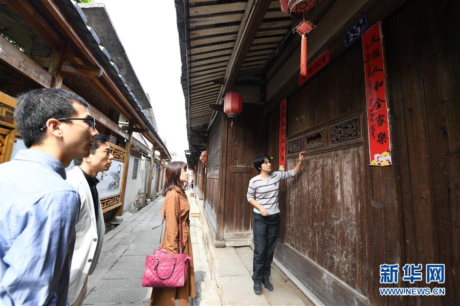 10月27日,琴江滿族村游客服務中心的鄭閩瓊(右一)向游客介紹三江口清朝水師旗營古兵房建筑特色。福州市長樂區琴江滿族村是福建省唯一的滿族聚居村,也是我國東南沿海保存較為完整的清代水師城堡。清雍正六年(1728年)時,清政府在此建立“福州三江口水師旗營”,鎮守閩江口,拱衛省城,緝捕海盜,打擊走私。這里成為當時全國四大水師旗營之一,隨后逐漸成為一個居民小鎮。有近300年歷史的琴江村既有軍事歷史背景,又有民族文化特色,2010年成為“中國歷史文化名村”。新華社記者 林善傳 攝