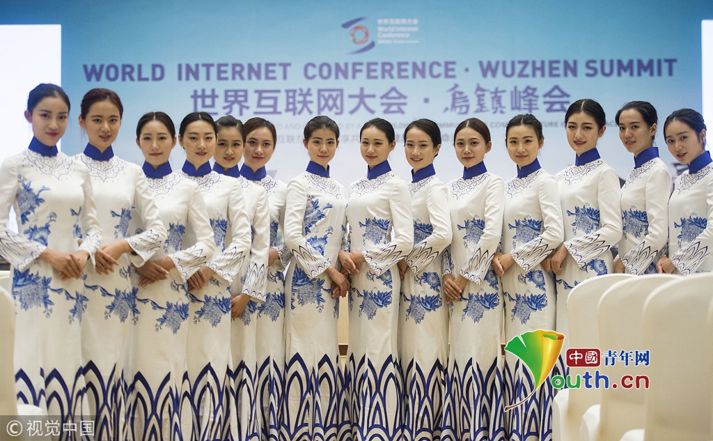 2014年11月17日,世界互聯(lián)網(wǎng)大會直播演練在浙江烏鎮(zhèn)舉行。來自浙江傳媒學院的大學生們,身著一襲青花瓷紋旗袍亮相,顯得分外嫵媚,引人注目。