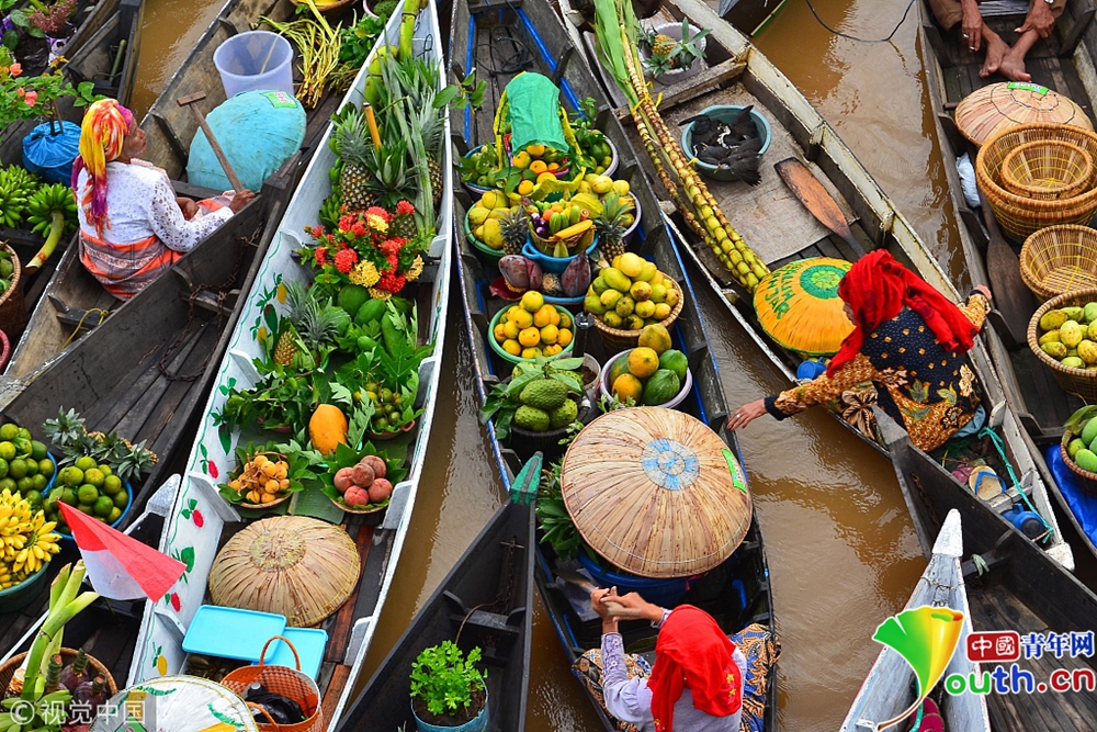 數以百計的小販們乘坐小船聚集在水上集市,出售他們親手采摘的新鮮果實和蔬菜,他們的衣著和貨物融合出令人驚嘆的色彩盛宴。 圖片來源:視覺中國