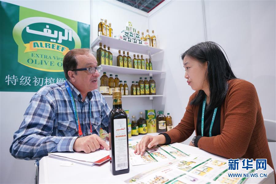11月6日,敘利亞橄欖油經銷商胡薩姆(左)介紹橄欖油產品。 新華社記者 孟鼎博 攝