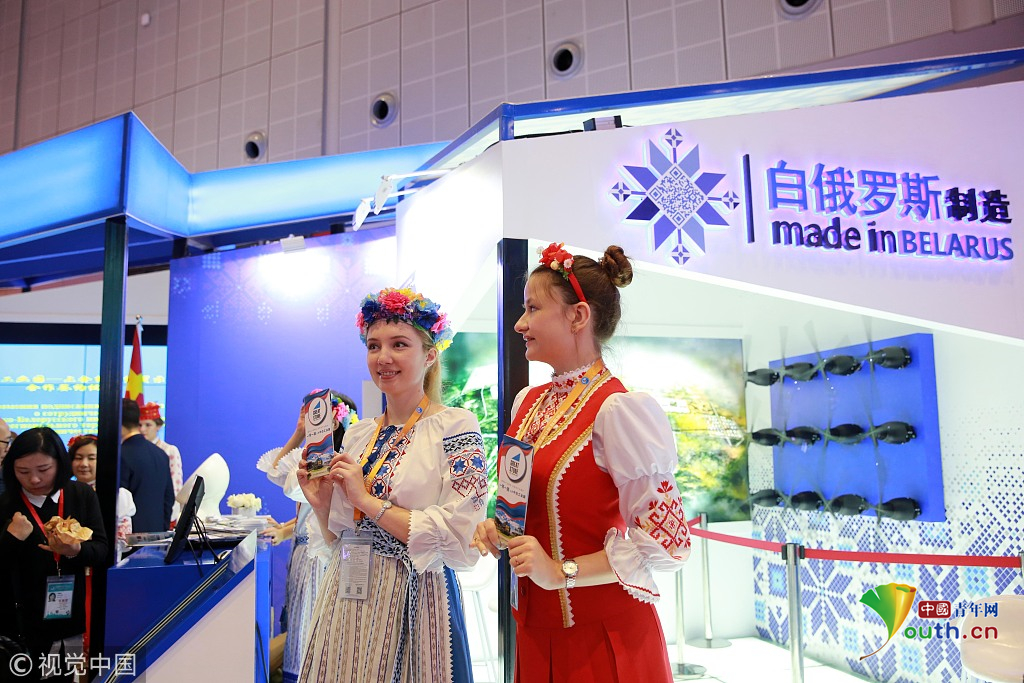 2018年11月6日,上海,首屆中國國際進口博覽會國家展上,共有82個國家、3個國際組織設立了71個展臺。白俄羅斯館。視覺中國