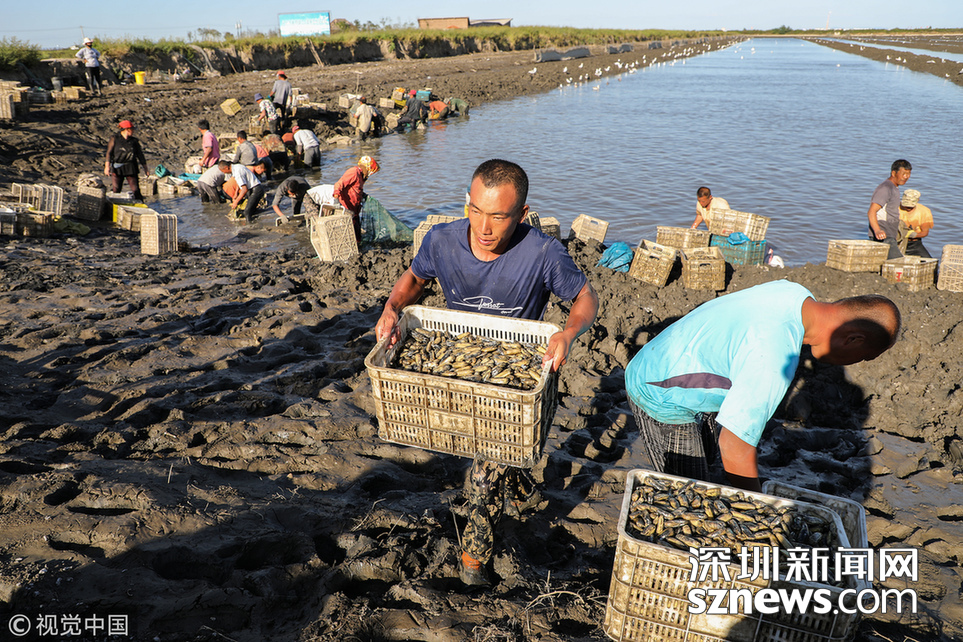 深圳新聞網訊  2018年9月8日,遼寧丹東,早上5點,挖蟶人紛紛下到各個池子,要在海水海泥里艱辛勞作10小時,直至下午3點集體上岸,等待買家的運輸車隊運走他們的勞動成果。9月初,遼寧沿海養殖區進入養殖海鮮的收獲季。在東港,常常出現數百人乃至上千人集結在池子里挖蟶子(這里特指縊蟶,即東港當地人所說的小人仙。下同)的壯觀景象。在養殖海鮮的收獲季,成群的海鷗趁機“助陣“,人與大自然和諧共處的畫面令人嘆為觀止。