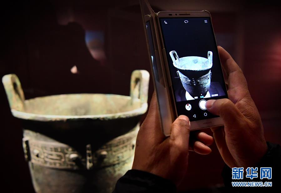 10月12日,參觀者在安陽博物館拍攝展品。目前,“鳳歸大邑商——殷墟婦好文物安陽故里展”正在安陽博物館展出,共展出文物474件。1976年被考古學家發現的婦好墓,是世界文化遺產、中國商代后期都城遺址——殷墟唯一保存完整的商代王室墓葬。新華社記者李安攝