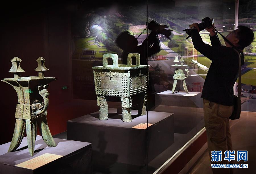 10月12日,參觀者在安陽博物館參觀拍攝。目前,“鳳歸大邑商——殷墟婦好文物安陽故里展”正在安陽博物館展出,共展出文物474件。1976年被考古學家發現的婦好墓,是世界文化遺產、中國商代后期都城遺址——殷墟唯一保存完整的商代王室墓葬。新華社記者李安攝