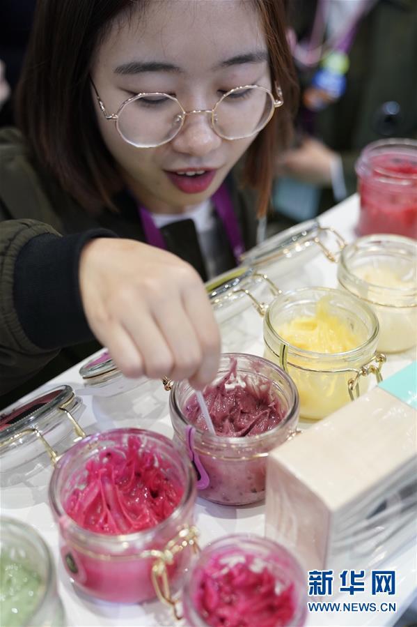 11月7日,在進博會食品及農產品展區的一家俄羅斯企業展位,一名參觀者品嘗混合純天然果汁的蜂蜜產品。 新華社記者 沈伯韓 攝