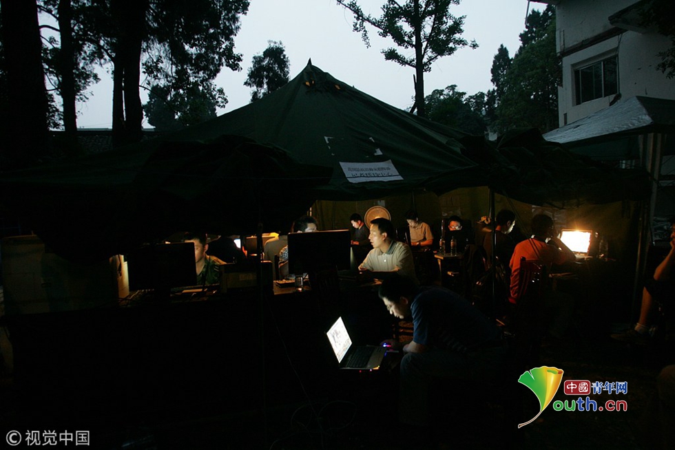 2008年5月17日晚。青川縣委宣傳部在機(jī)關(guān)大院倒塌的廢墟上,為從各地趕來(lái)的記者設(shè)立了帳篷發(fā)稿中心,此前由于通訊中斷與外界失去聯(lián)系,比起其它災(zāi)區(qū)被媒體關(guān)注晚了三天,被譽(yù)為“最后發(fā)現(xiàn)的重災(zāi)區(qū)”。圖片作者:李杰/視覺(jué)中國(guó)