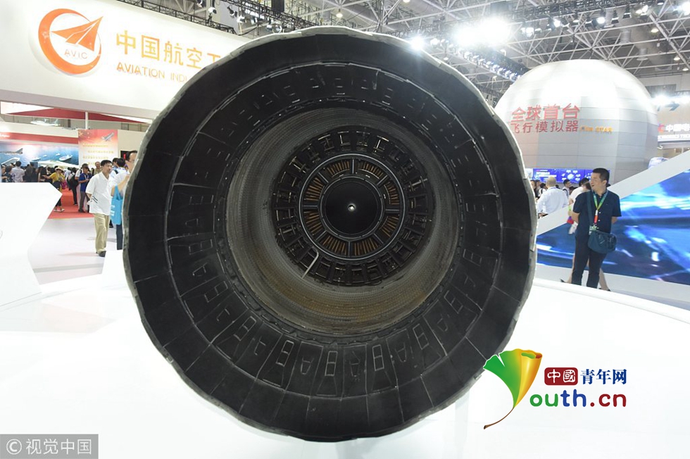 2018年11月7日,珠海航展上,觀眾在觀看國產新型渦扇發動機“太行發動機”。圖片作者:龍巍/視覺中國