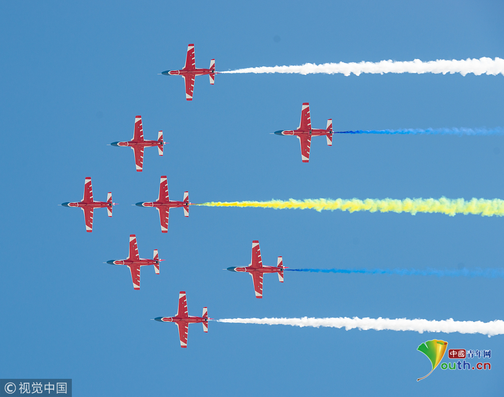 2018年11月7日,廣東珠海,第12屆珠海航展在金灣機場如火如荼進行。空軍航空大學“紅鷹”飛行表演隊在第十二屆中國航展進行了飛行表演,展示了飛行員精湛的飛行技能。視覺中國