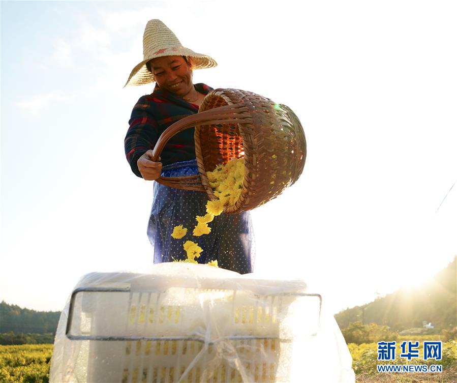 11月8日,婺源縣思口鎮農戶將采摘好的皇菊收到筐中準備外運。新華社記者 胡晨歡 攝
