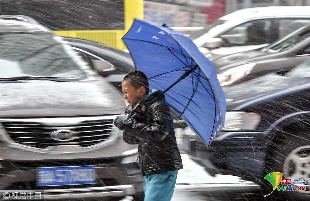 2018年11月12日,持續濃霧天氣的新疆烏魯木齊市,又迎來一場雨雪天氣,氣溫隨之驟降。圖為一名男孩打著雨傘與風雪“抗爭”。圖片作者:劉新