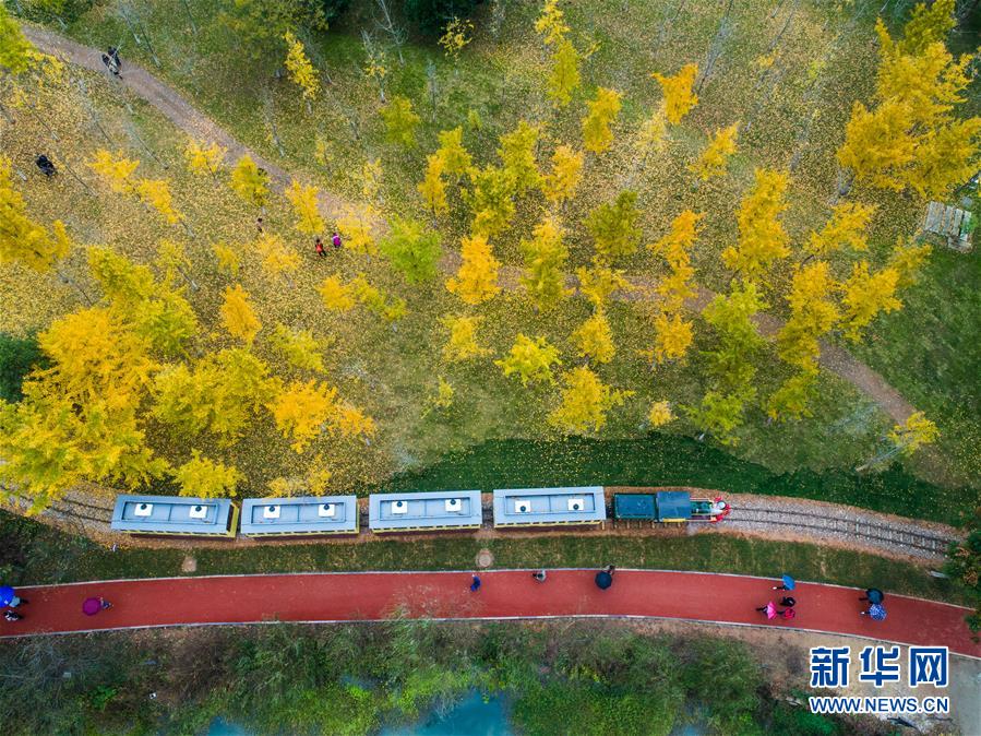 一列觀光小火車(chē)帶著游客穿行在銀杏林里(11月16日無(wú)人機(jī)拍攝)。近日,在浙江省長(zhǎng)興縣小浦鎮(zhèn),“十里銀杏長(zhǎng)廊”和近千畝花海經(jīng)過(guò)近一年的升級(jí)改造后,以嶄新的面貌與游客見(jiàn)面。花海、觀光小火車(chē)、古村民宿、銀杏長(zhǎng)廊等旅游項(xiàng)目全面提升了小浦鎮(zhèn)鄉(xiāng)村旅游的品質(zhì)。新華社記者 徐昱 攝