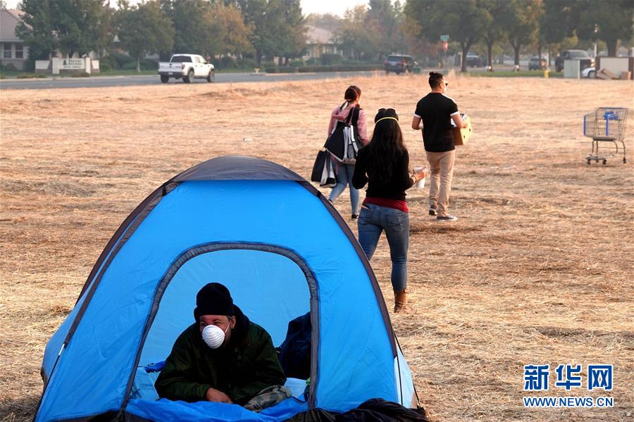 11月18日,在美國加利福尼亞州比尤特縣奇科,災民在沃爾瑪停車場搭起帳篷暫居。 新華社記者吳曉凌攝