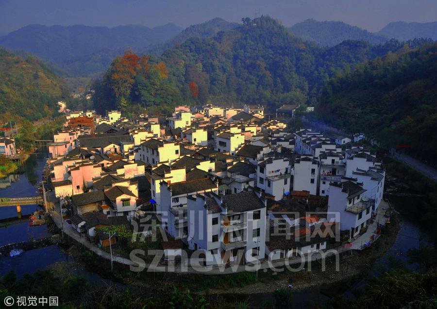 小河呈大半圓形,繞村莊將近一周,四周高山環繞,新修的柏油公路沿著河流呈圓弧形繞村而過,一些木板橋與公路相連。
