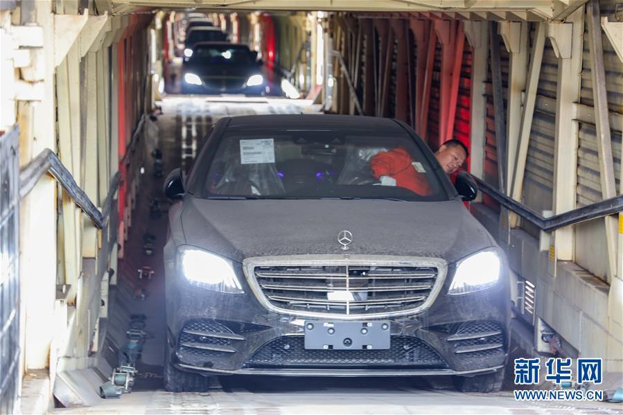11月19日,在首趟中歐班列商品車專用車運輸國際班列的車廂內,工作人員駕駛著進口整車進行卸貨作業。 新華社記者 劉潺 攝