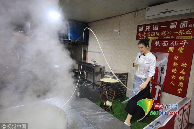 2018年11月19日,成都,繼“妖嬈拉面哥”之后,黃龍溪古鎮一個身材高挑的古裝美女,一邊跳舞一邊揮甩著手中的面條被贊“甩面仙子”走紅網絡。圖片作者:紅葉/視覺中國