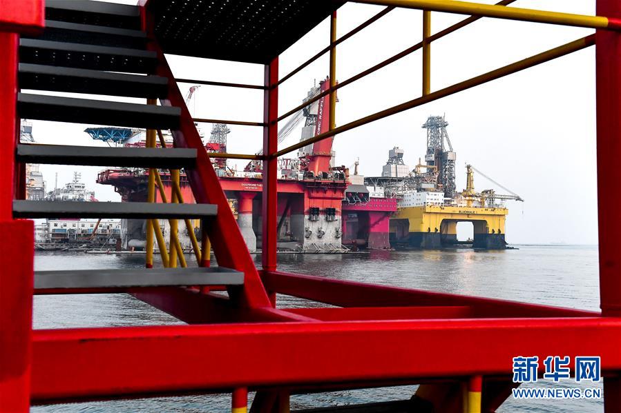 中集來福士海洋工程有限公司煙臺基地深水碼頭停放的半潛式鉆井平臺(11月14日無人機航拍)。新華社發(fā)(張丞攝)