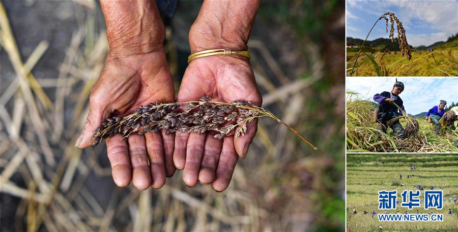 拼版照片:左圖為在安太鄉(xiāng)元寶村,80歲的賈榮專手捧剛剛收獲的香糯;右上圖為成熟待收的香糯;右中圖為賈榮專(左)在收割香糯;右下圖為村民們在收香糯(照片均攝于10月30日)。2017年,賈榮專加入村里的香糯種植合作社。香糯是廣西融水大苗山的特產(chǎn),它生長在高寒高海拔的特殊自然環(huán)境中,產(chǎn)量少,營養(yǎng)價(jià)值高。 廣西融水苗族自治縣是國家扶貧工作重點(diǎn)縣,全縣“九山半水半分田”,生活生產(chǎn)環(huán)境較為惡劣,脫貧攻堅(jiān)任務(wù)艱巨,目前還有7.68萬貧困人口。面對經(jīng)濟(jì)發(fā)展落后、貧困面廣且程度深的現(xiàn)狀,當(dāng)?shù)匕衙撠毠?jiān)與創(chuàng)新產(chǎn)業(yè)扶持相結(jié)合,依托生態(tài)資源優(yōu)勢,實(shí)施“特色產(chǎn)業(yè)富民行動”,通過發(fā)展特色民族旅游、林下經(jīng)濟(jì)和特色養(yǎng)殖業(yè)等扶貧產(chǎn)業(yè),帶動貧困群眾依靠勤勞的雙手,拔窮根摘窮帽,實(shí)現(xiàn)脫貧致富。據(jù)了解,目前全縣貧困戶參與特色產(chǎn)業(yè)發(fā)展的有2.9萬戶,扶貧產(chǎn)業(yè)覆蓋率達(dá)95%。 新華社記者 黃孝邦 攝