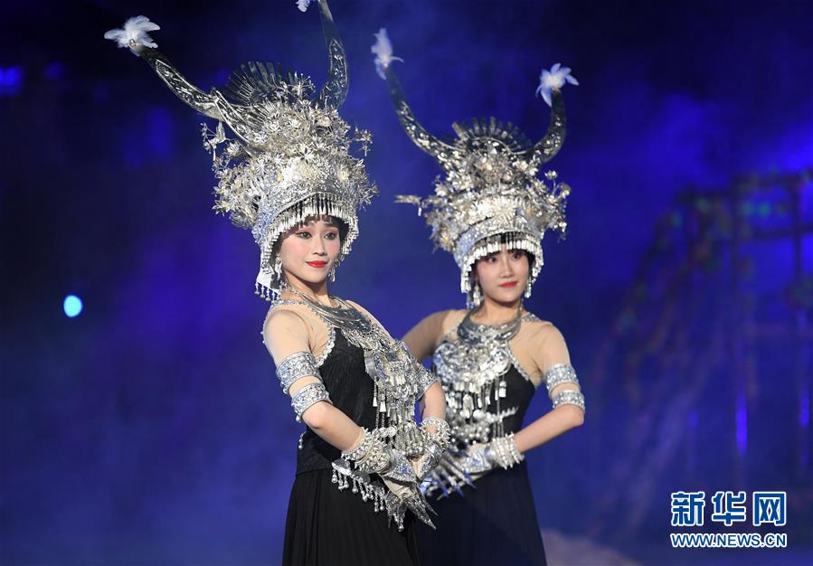11月21日,演員表演舞蹈《苗族銀落》。 當日,廣西柳州市第一屆旅游產業發展大會暨2018第十八屆中國·融水苗族蘆笙斗馬節開幕式晚會在融水苗族自治縣舉行。 新華社記者 周華 攝